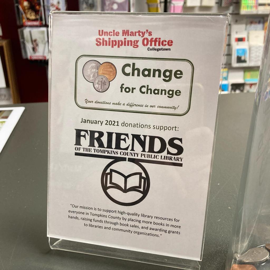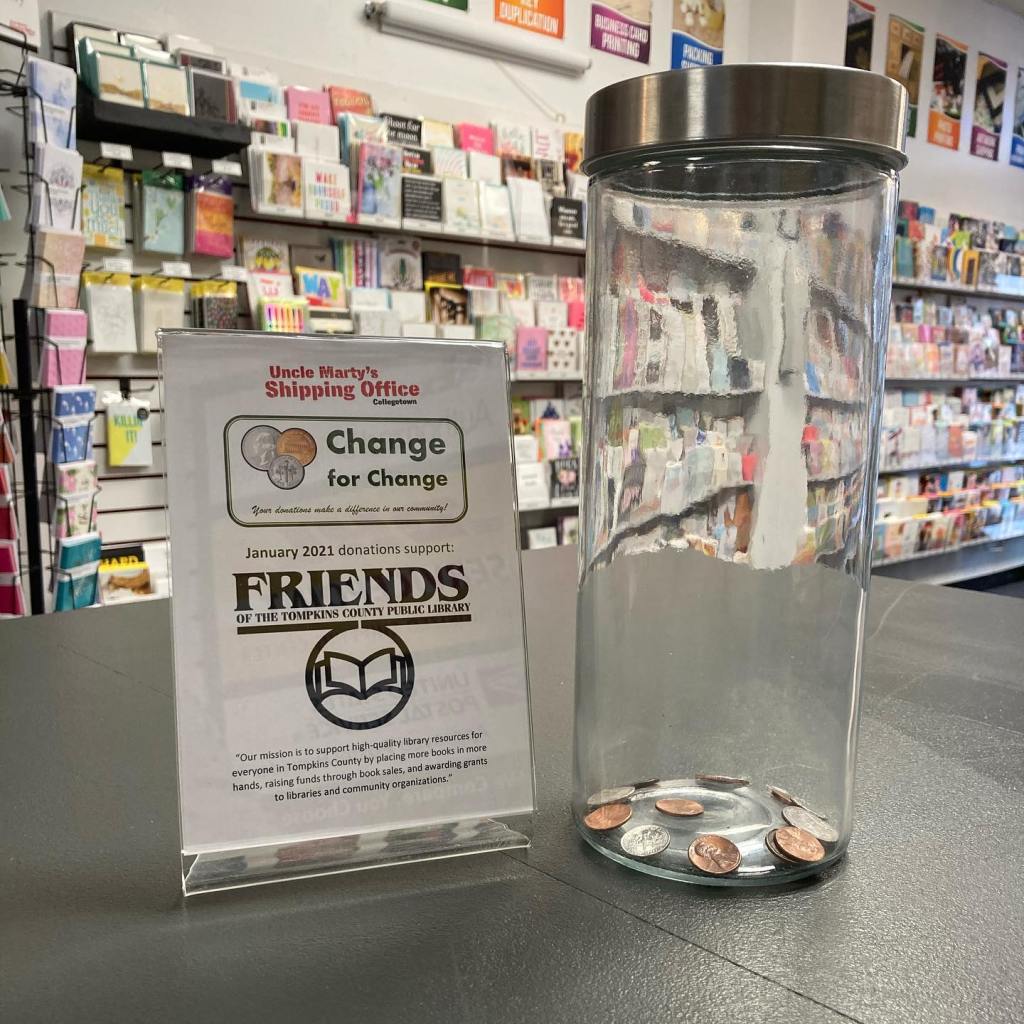 This January, our Change for Change program will benefit Friends of the Tompkins County Public Library. Help us raise some coin for this important organization that makes such a huge difference in our and our neighboring communities.